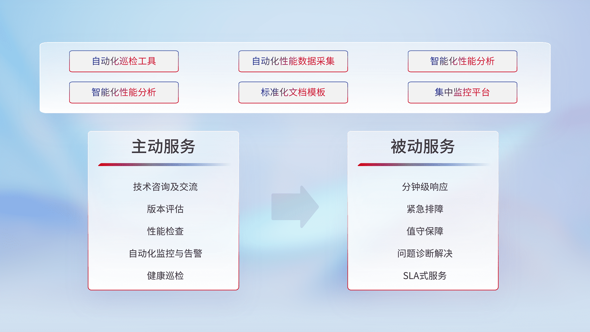 智能化工具和标准化文档,,,,保障服务质量,,,,提供主动服务(包含技术咨询、、、版本评估、、、、性能检查、、、自动化监控与告警、、健康巡检)和被动服务包含(分钟级响应、、紧急排障、、值守保障、、问题诊断解决、、SLA服务)。。。。